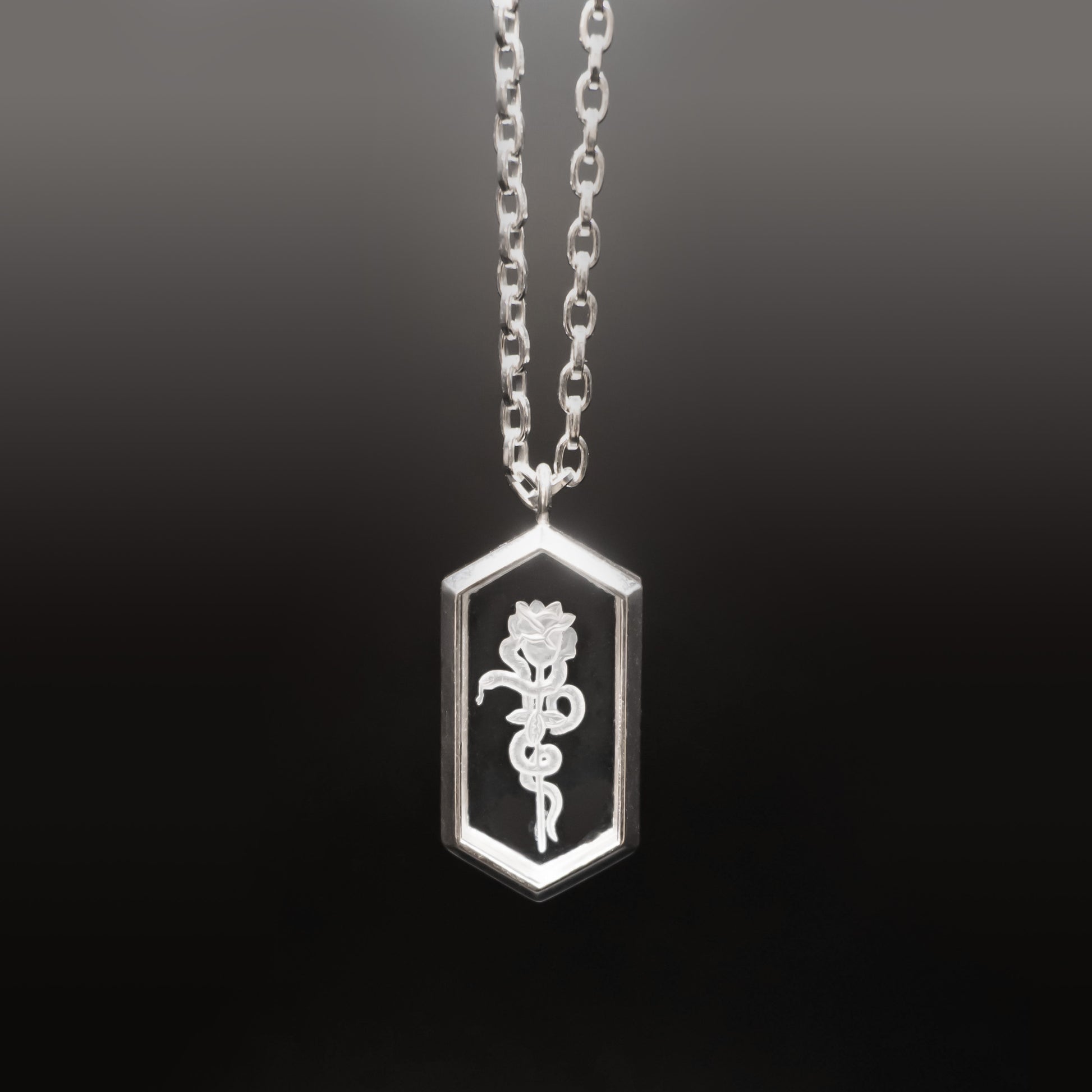 Hexagonal intaglio pendant featuring clear quartz with intricate hand-carved designs. Each piece is a delicate balance of artistry and craftsmanship, showcasing symbolic motifs that feel timeless and powerful.